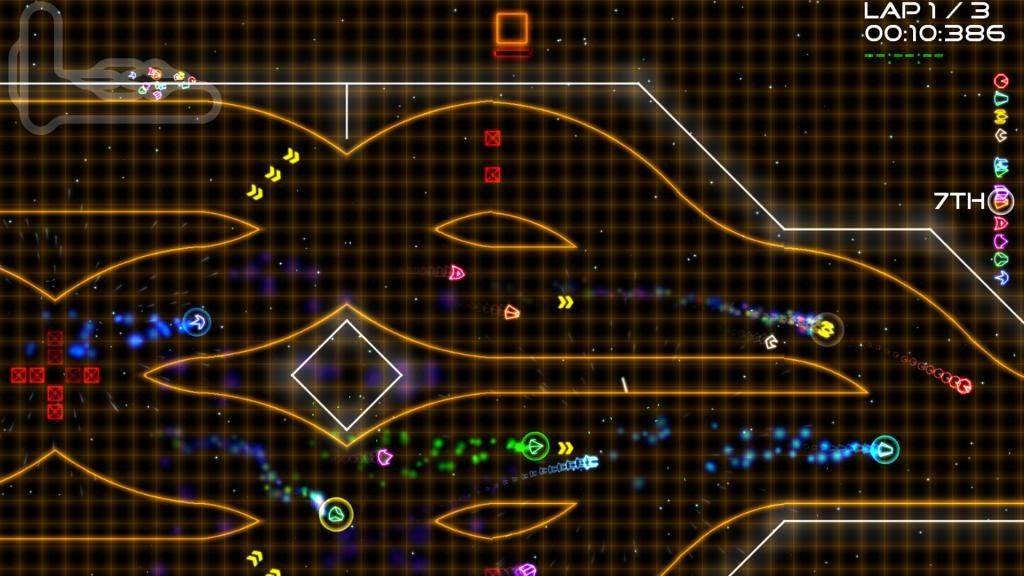 Las naves, las pistas, todo en éste juego está representado con líneas de luz, dispuestas en formas geométricas, representando la velocidad y caos de las carreras. Las carreras son bastante involucradas, ya que aparte de la velocidad de las naves y la complejidad de las pistas, también tienes que enfrentarte a las armas que tú y tus oponentes pueden recoger. En Super Laser Racer tienes cosas como misiles, armas plasma, escudos, turbo y demás. El resultado es que tú y tus oponentes van a estar volando por la pista repleta de explosiones y rayos laser.